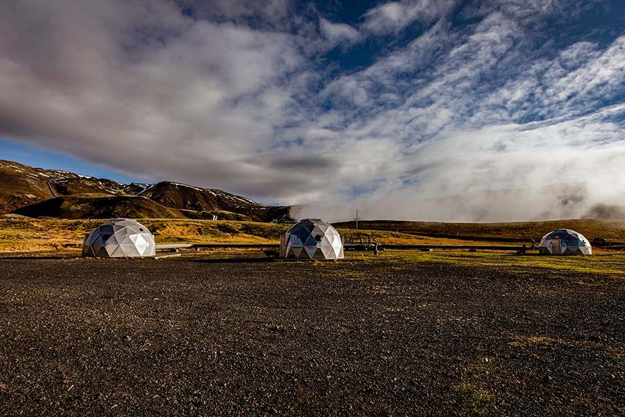 Steel igloos cover injection wells that the Icelandic start-up company Carbfix uses to inject carbon dioxide into the earth outside Reykjavik, Iceland, on Oct. 6, 2021. Carbfix has discovered that its CO2 mix will chemically react with basalt and turn to rock in just two or three years instead of the centuries that the mineralization process was believed to take Image: Sigga Ella/The New York Times[br]
