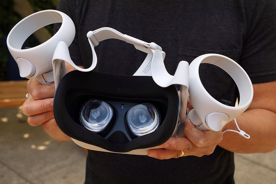 Facebook’s Oculus Quest 2 virtual reality headset in Oakland, Ca., on Sept. 14, 2020. The Quest 2’s headset and controllers include motion sensors to follow your head and hand movements. Image: Jim Wilson/The New York Times