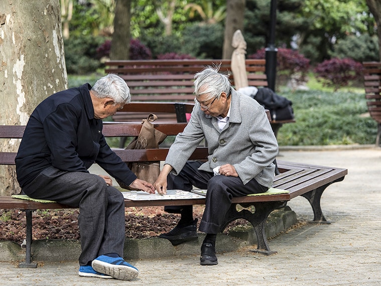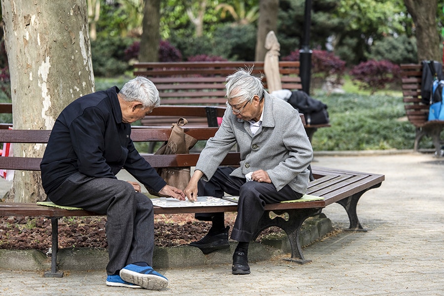 Two people play Chinese chess whilst seated on a bench in a park in Shanghai, China, on Saturday, April 10, 2021. China"s population is aging more quickly than most of the worlds developed economies due to decades of family planning aimed at halting population growth. Image: Qilai Shen/Bloomberg via Getty Images