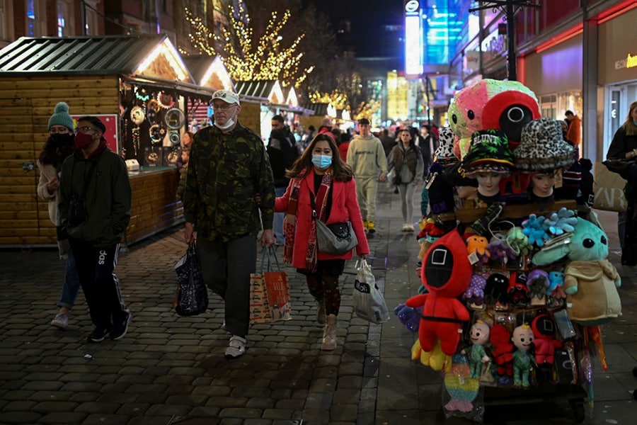 Shoppers, some wearing face coverings to combat the spread of Covid-19, walk past stores on the Monday before Christmas in Manchester in north-west England on December 20, 2021. - The UK Government on Monday faced pressure to tighten coronavirus restrictions to prevent the spread of the Omicron variant, despite opposition to do so before Christmas.