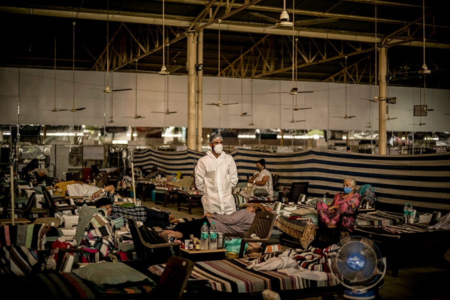Patients who are tested positive of the Covid-19 coronavirus take rest inside a isolation / Covid care center set up by a Charitable institute with the support from the Delhi Government in the wake of rising cases of the Covid contagion on May 23, 2021 in New Delhi, India. India"s prolonged and devastating wave of Covid-19 infections has gripped cities and overwhelmed urban health resources, but it has also reached deep into rural India, where the true extent of devastation may never be known because of the lack of widespread testing or reliable data. (Photo by Anindito Mukherjee/Getty Images)