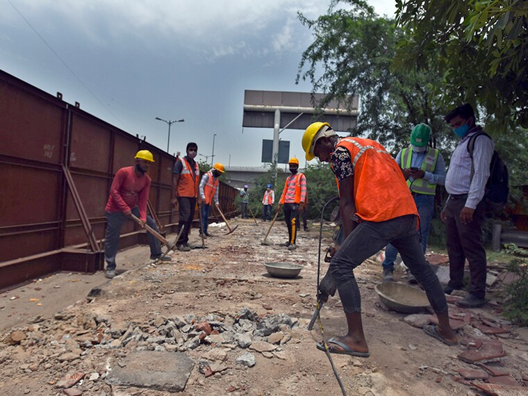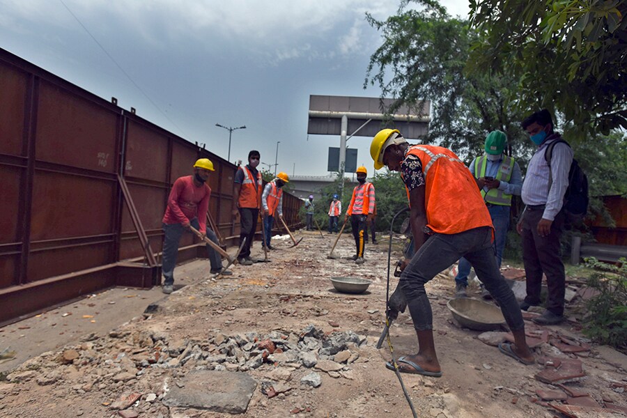 NEW DELHI, INDIA - MAY 31: Labourers working at a constrution site following Covid-19 protocols, near Barapula flyover on May 31, 2021 in New Delhi, India. Delhis factories and manufacturing units reopened on Monday as the Delhi government gradually lifts lockdown restrictions that have been in place since April 20. According to the Delhi governments guidelines for the unlock process, manufacturing and constructions units have been allowed to resume work with staggered working hours to maintain social distancing.