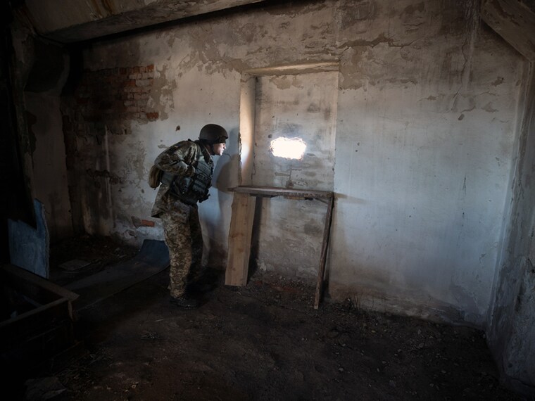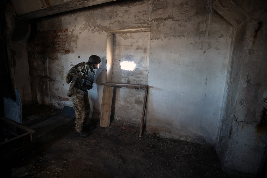 A Ukrainian Army soldier keeps a lookout from a front line position in Krasnohorivka, Ukraine, on Monday, Feb. 14, 2022. The biggest immediate energy threat from a Russian invasion would be Russian natural gas exports through Ukrainian pipelines that flow to Europe. (Tyler Hicks/The New York Times)