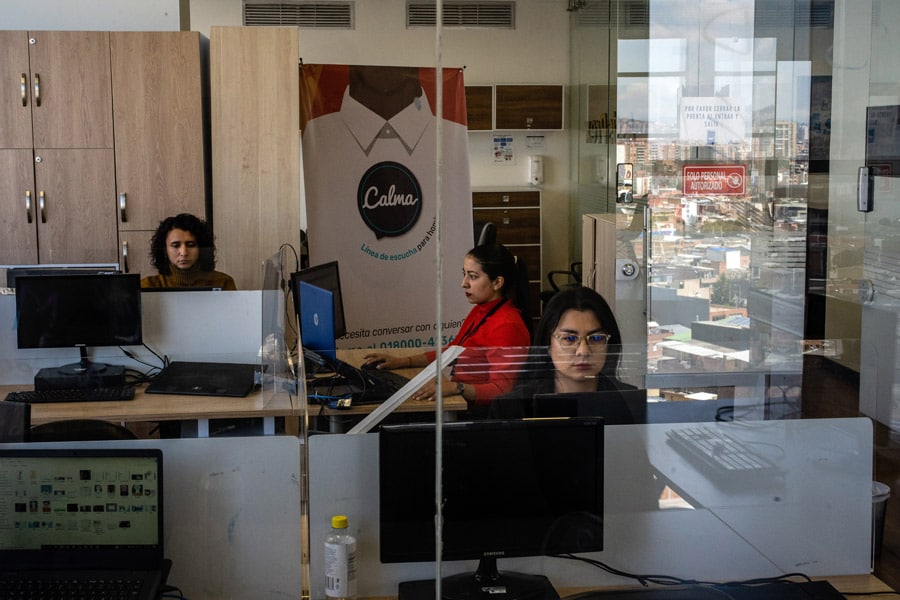 Psychologists working at the Calm Line in Bogotà¡, Colombia, on Oct. 14, 2021. The hotline puts men at the center of the conversation about violence against women, in an effort to teach them to understand their emotions and control their actions. (Federico Rios/The New York Times)