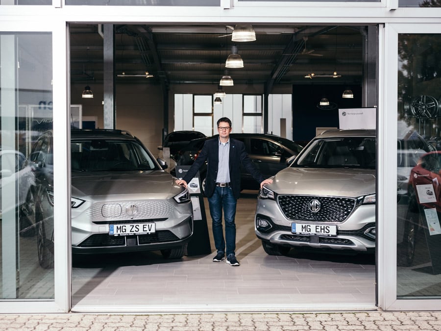 Bastian Stark at his dealership that sells MG electric and hybrid vehicles in Unterpleichfeld, Germany, Oct. 28, 2021. By selling battery-powered S.U.V.s and luxury sedans in places like Germany and Norway, China is striving to become a force in the global auto industry. (Felix Schmitt/The New York Times)