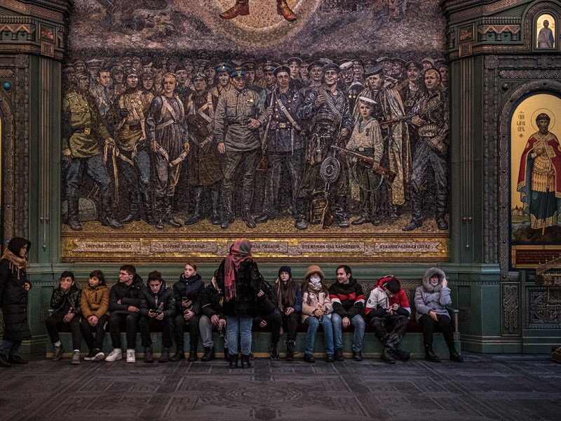 Visitors of the Cathedral of Russian Armed Forces in Kubinka, Russia on Dec. 12, 2021, where a mosaic of Soviet soldiers in World War II-era uniforms is featured. (Sergey Ponomarev/The New York Times)