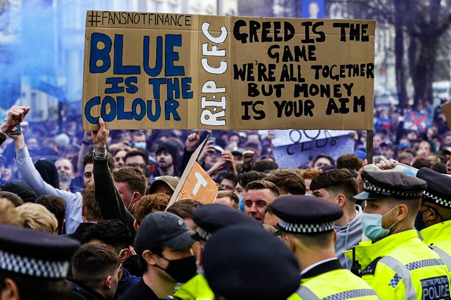 Football supporters demonstrate against the proposed European Super League outside of Stamford Bridge football stadium in London on April 20, 2021, ahead of the English Premier League match between Chelsea and Brighton and Hove Albion. - The 14 Premier League clubs not involved in the proposed European Super League "unanimously and vigorously rejected" the plans at an emergency meeting on Tuesday. Liverpool, Arsenal, Chelsea, Manchester City, Manchester United and Tottenham Hotspur are the English clubs involved.
