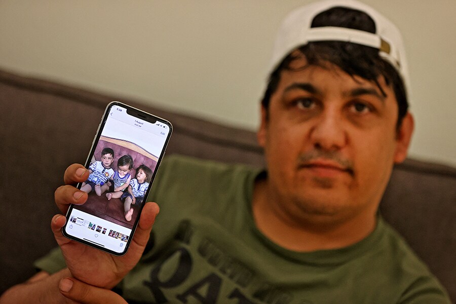 Afghan refugee Ahmad Wali Sarhadi, 28, displays a pictue of his children on his phone as he rests at his accommodation at Park View Villas, a Qatar"s 2022 FIFA World Cup residence designated to host the event"s guests and participants, transformed into a housing centre for Afghan refugees, in Doha, he was able to get out after he sent panicked emails to the international news media outlets he had worked for. His children remain in Afghanistan. (Photo by KARIM JAAFAR/AFP via Getty Images)
