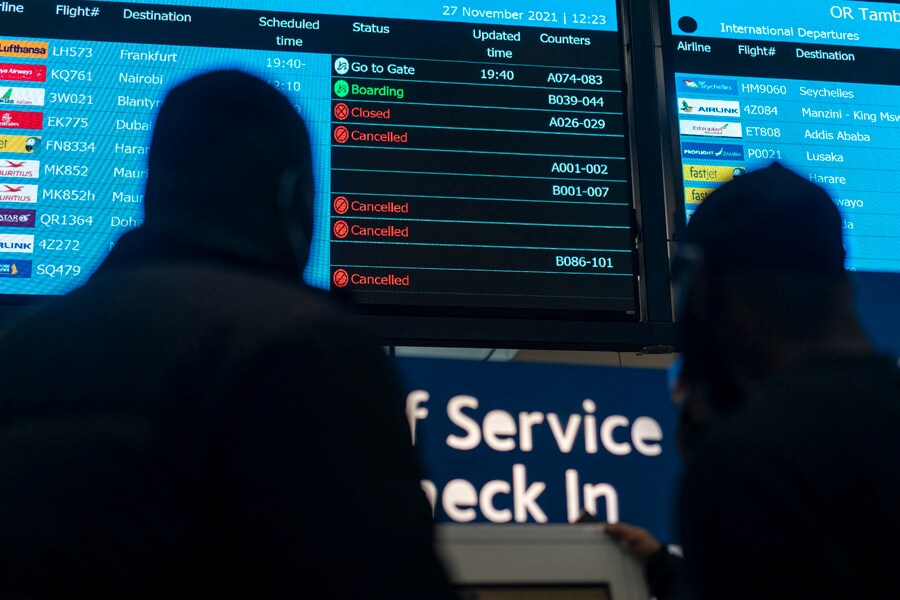 Flights to numerous destinations were cancelled at O.R. Tambo International Airport in Johannesburg, Nov. 27, 2021. A confounding array of Covid rules and lax enforcement of mask wearing may have sent infected passengers on two KLM flights from South Africa into ‘who knows where.’ (Joao Silva/The New York Times)