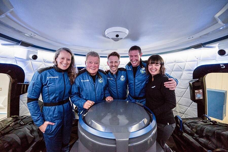An undated photo provided by Blue Origin shows the crew of NS-18, from left: Audrey Powers, William Shatner, Chris Boshuizen, and Glen de Vries, along with CrewMember 7 Sarah Knights, a trainer, on Oct. 12, 2021. After Blue Origin’s latest launch on Oct. 13, 2021, much of the initial reaction focused more on William Shatner’s introduction to outer space than the particulars of the flight or issues with the company behind it. Image: Blue Origin via The New York Times[br]