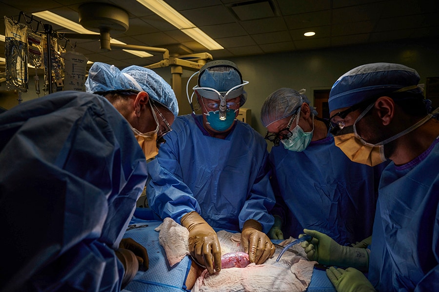A photo provided by NYU Langone Health shows a surgical team at the hospital in New York examining a pig kidney attached to the body of a deceased recipient for any signs of rejection in September 2021. From left are Drs. Zoe A. Stewart-Lewis, Robert A. Montgomery, Bonnie E. Lonze and Jeffrey Stern. Image: Joe Carrotta/NYU Langone Health via The New York Times
