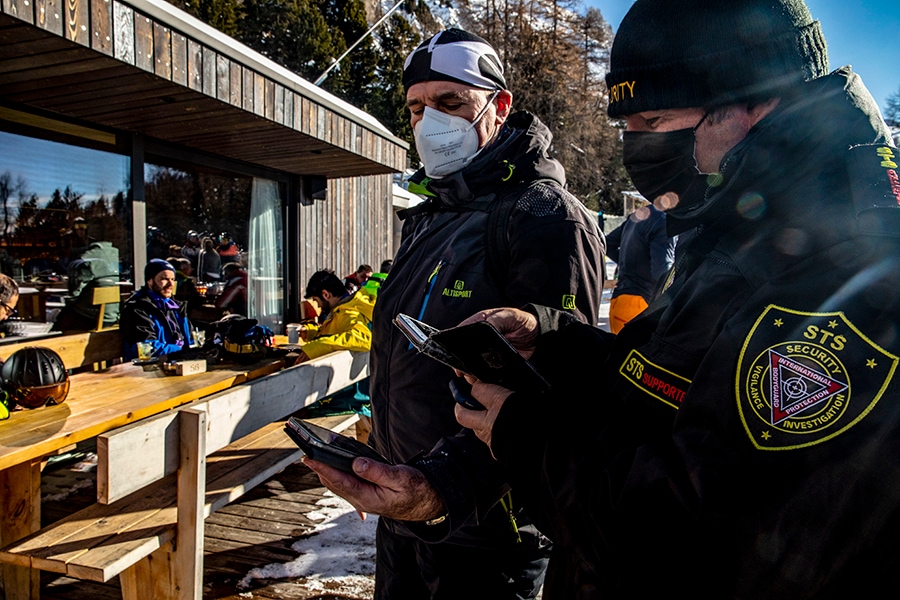 BOLZANO, ITALY - DECEMBER 12: People have their Green Pass checked before entering a restaurant next to the ski slopes on December 12, 2021 in Obereggen, Italy. Ski facilities remained inactive for two years during the Covid-19 pandemic, re-opening in recent weeks with the hope of boosting tourism, yet with high infection rates and low vaccine turn-out the 2021 season remains uncertain. To combat the rise in Covid-19 cases in Italy, the government tightened health restrictions with a "super green pass" as of December 6. (Photo by Francesca Volpi/Getty Images)