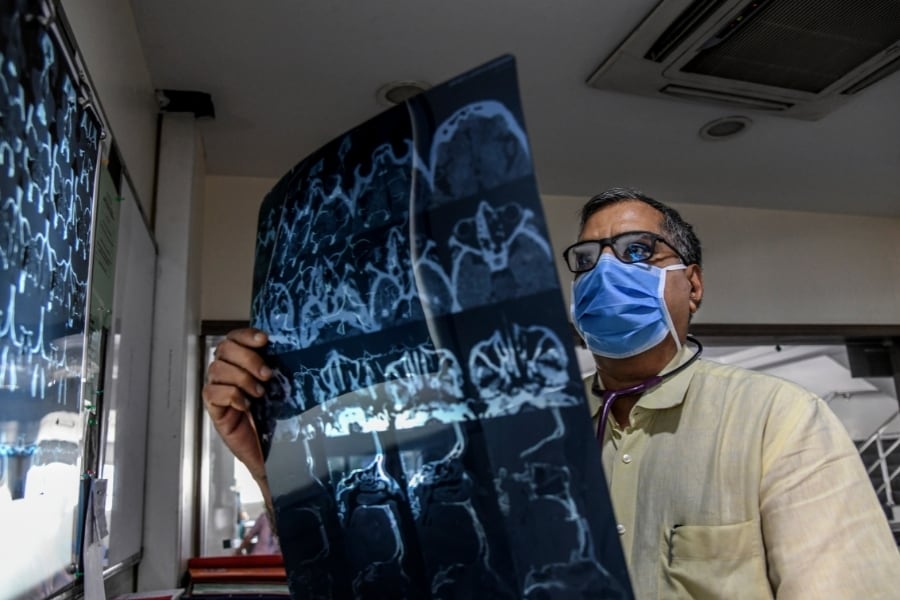 Dr. Atul Patel examines a scan of a patient recovering from mucormycosis at Sterling Hospital in Ahmedabad, June 10, 2021. The deadly disease has sickened former coronavirus patients across the country. Doctors believe that hospitals desperate to keep Covid-19 patients alive made choices that left them vulnerable. (Atul Loke/The New York Times)[br]