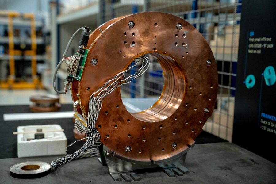 A powerful magnet of the type used in fusion devices in a lab at Tokamak Energy in Abingdon, England, on Aug. 23, 2021. Tokamak is beginning to license the know-how behind its magnets, which it uses to contain and compress the superheated gas. (Andrew Testa for The New York Times)