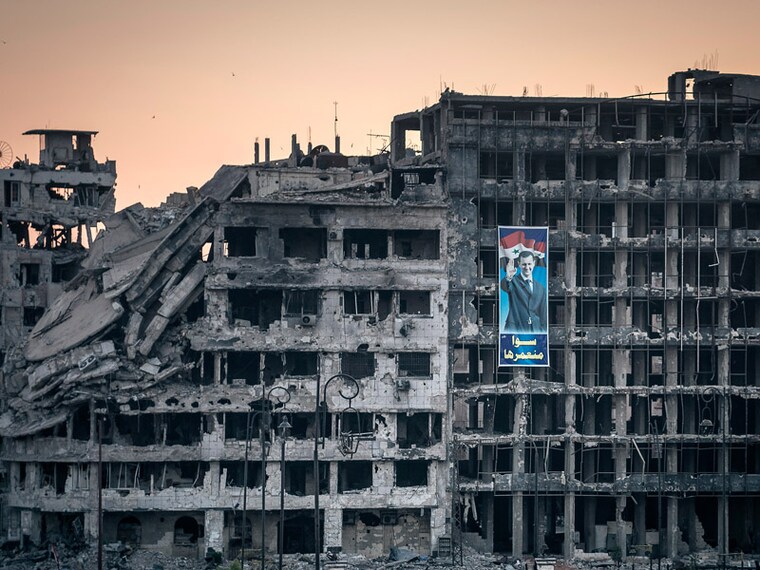 A poster of President Bashar al-Assad hangs from the ruins of a shopping mall in Homs, Syria, June 15, 2014. Powerful associates of Syria’s president are making and selling captagon, an illegal amphetamine, creating a new narcostate on the Mediterranean. (Sergey Ponomarev/The New York Times)