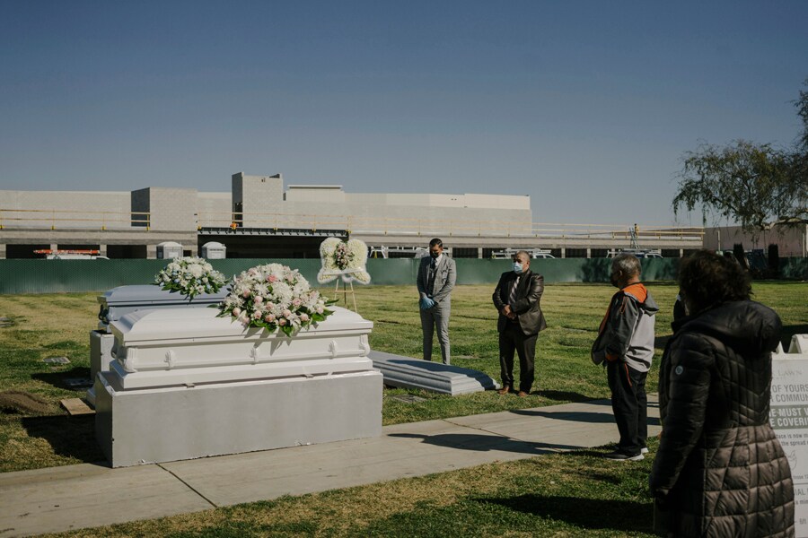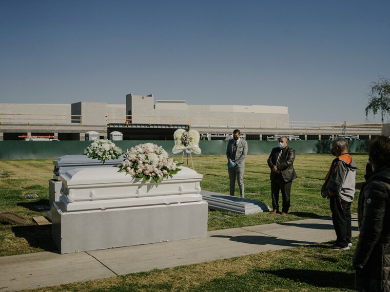 The coffins holding Maria Serrano, 98, and her son Victor, 67, who both died after complications from COVID-19, at Park Lawn Cemetery in Los Angeles, Feb. 5, 2021. Approximately 75 percent of people who have died of the COVID-19 virus in the U.S. — or about 600,000 of the nearly 800,000 who have perished so far — have been 65 or older. (Isadora Kosofsky/The New York Times)