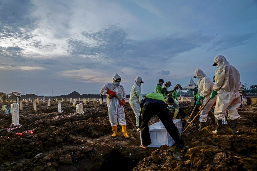 Funeral taking place with COVID-19 protocol at Rorotan TPU, Cilincing, North Jakarta, Indonesia. Tuesday, June 29, 2021. Image: Aslam Iqbal/NurPhoto via Getty Images
