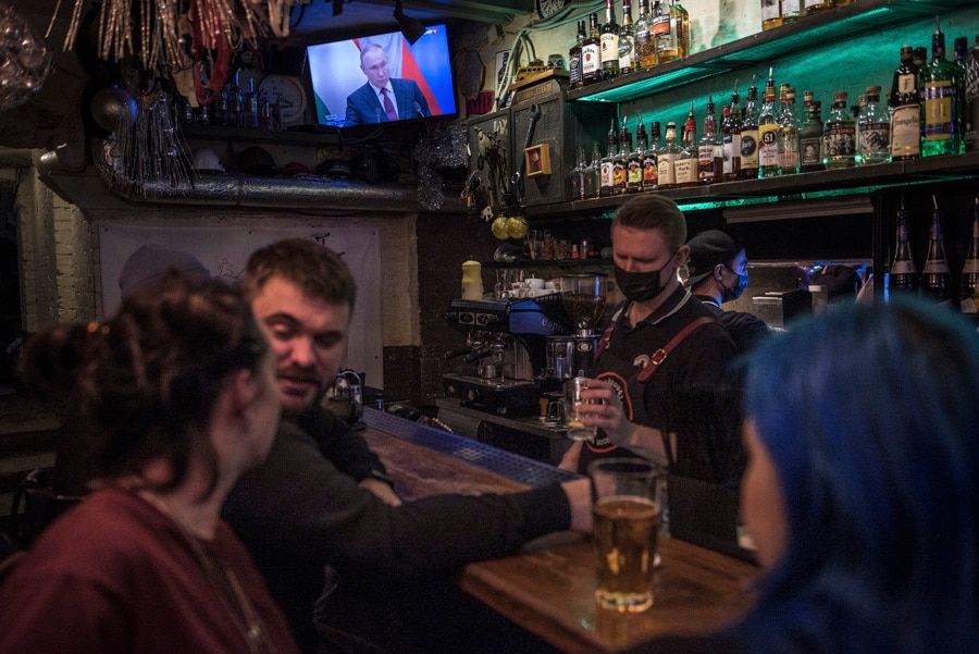 People talk at a bar as President Vladimir Putin is seen on a TV in Moscow, Feb. 1, 2022. Since paying the price for annexing Crimea in 2014, Russia has tried to make its economy sanctions-proof, hoarding currency to insulate the country. (Sergey Ponomarev/The New York Times)