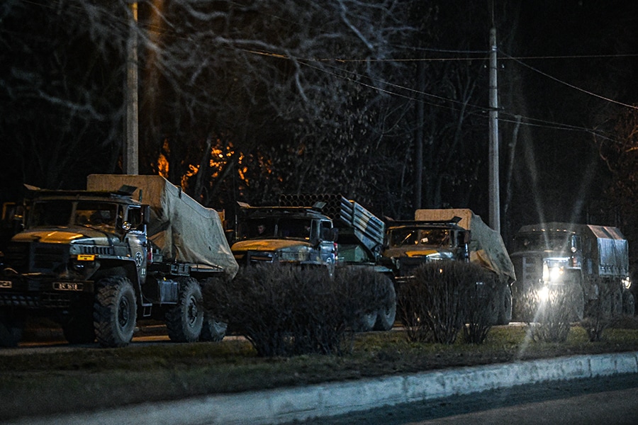 Russian military tanks and armored vehicles advance in Donetsk, Ukraine on February 24, 2022. (Photo by Stringer/Anadolu Agency via Getty Images)"‹