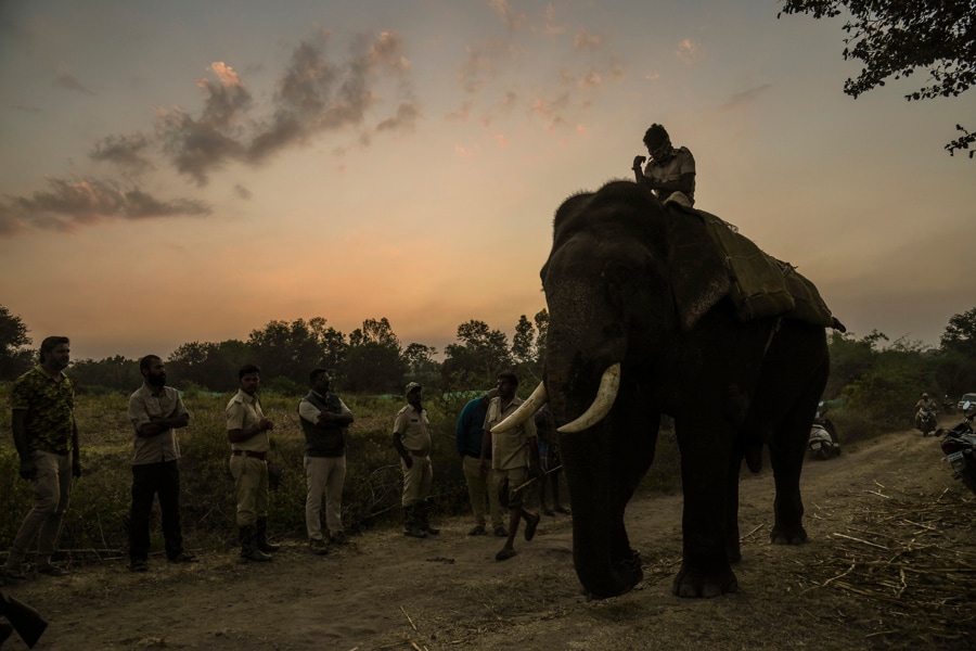 A forest officer on a trained elephant searches for a stray tiger in a village in Karnataka, India, Jan. 6, 2022. Braving tigers and other dangers, frontline workers face difficult working conditions as they try to keep the peace between humans and wildlife. (Atul Loke/The New York Times)