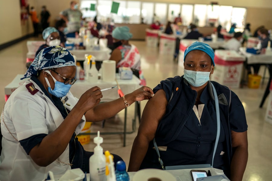 A health care worker is given the Johnson & Johnson COVID-19 vaccine at an assembly hall on the grounds of Charlotte Maxeke Johannesburg Academic Hospital in Johannesburg, South Africa, March 5, 2021. A concerning new variant of the coronavirus, whose mutations evidence a “big jump in evolution," is driving a spike in new COVID-19 infections in South Africa, scientists said on Thursday, Nov. 25. (Joao Silva/The New York Times)
