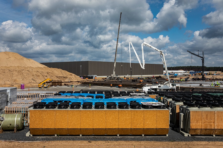 The Tesla plant in Grà¼nheide, Germany on July 2, 2021, is at least six months behind schedule, according to local officials. And Tesla may be even further away from producing cars in Germany because construction has only just begun on an adjacent factory that will supply batteries. Image: Andreas Meichsner/The New York Times