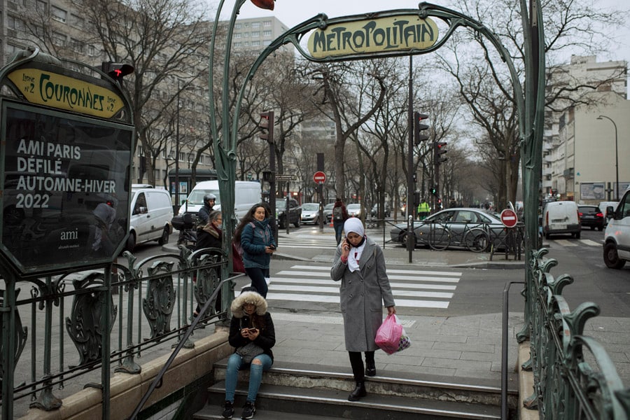 The Couronnes metro station in a neighborhood known for a big Muslim community, in Paris, Jan. 25, 2022. All the talk of France’s presidential election campaign is about immigration, but it is the quiet flight of French Muslims from France that points to a deeper crisis for the country. (Dmitry Kostyukov/The New York Times)