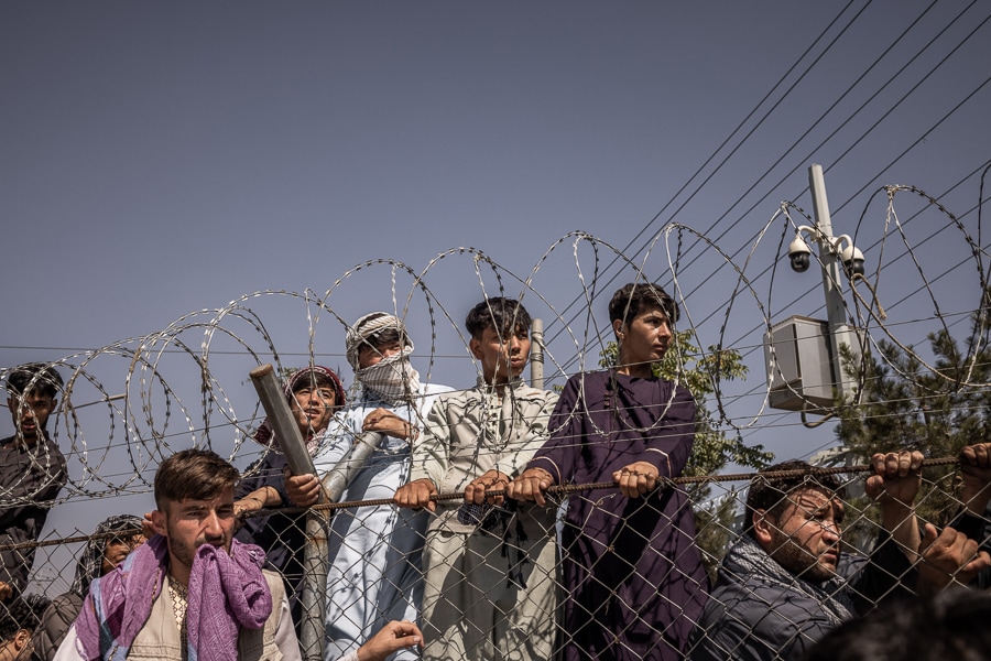 People gather in front of the international airport in Kabul, Afghanistan on Monday, Aug. 16, 2021, after the Taliban took control of the country Image: Jim Huylebroek/The New York Times[br]