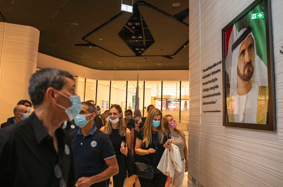 An Israeli group of entrepreneurs passes by an image of Mohammed bin Rashid Al Maktoum in the Burj Khalifa, the world’s tallest building, in Dubai, United Arab Emirates, Oct. 27, 2020. The United Arab Emirates, a hub of international commerce, announced Tuesday, Dec. 7l, 2021 that it would shift its weekends to bring them more in line with the Western calendar and global markets, once again showing its willingness to part ways with its Arab neighbors. (Dan Balilty/The New York Times)