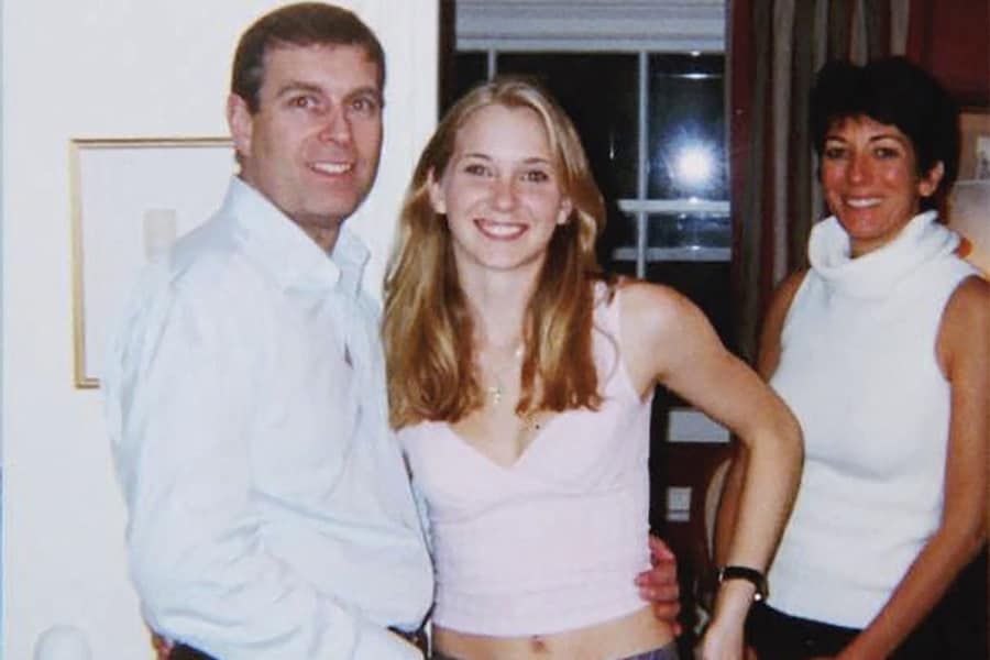 In an undated image provided by federal prosecutors, Prince Andrew with Virginia Giuffre, who accuses him of raping her as a teenager, and Ghislaine Maxwell. As Giuffre’s lawsuit against Andrew proceeds, Buckingham Palace has announced that it would force Andrew to relinquish all his military titles and the honorific, “His Royal Highness." (Southern District of New York via The New York Times)
