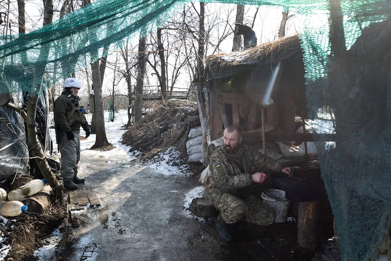 Ukrainian soldiers at a front line position near Katerynivka, in eastern Ukraine, on Wednesday, Feb. 16, 2022. Military analysts caution that it is too early to make firm conclusions about a possible drawdown of Russian forces without more information about which units are being sent back to their bases. (Tyler Hicks/The New York Times)