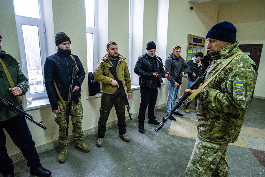 An instructor discusses urban combat as Ukrainian civilians undergo basic military training at a volunteer center in a state educational institution, before an expected Russian assault on March 5, 2022 in Odessa, around 132 kms East of Mykolaiv, Ukraine. The Ukrainian volunteers are trained by former, reserve and veteran Ukrainian officers. Russian forces invading Ukraine from three sides since February 24 have frequently met fierce resistance, and these trainees say they aim to help deprive Russia of the prized Black Sea port of Odessa.