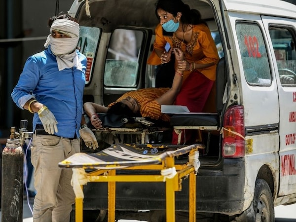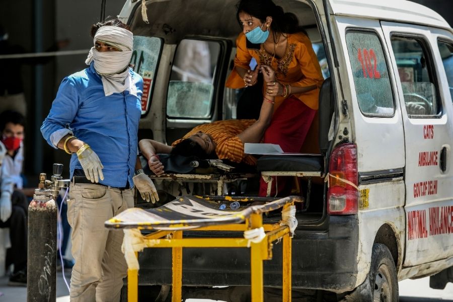 A relative waits with a COVID-19 patient inside an ambulance outside a hospital in Delhi, India, April 24, 2021. (Atul Loke/The New York Times)[br]