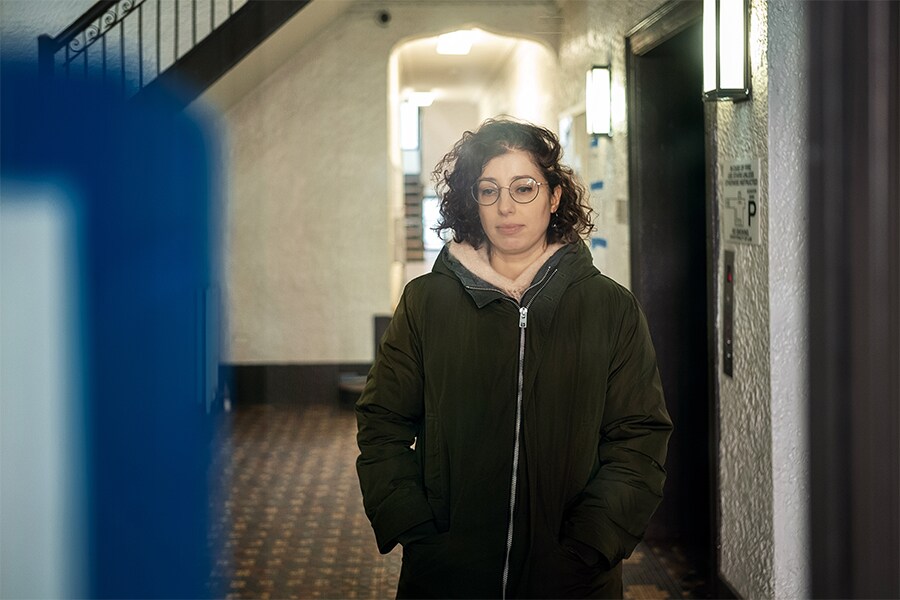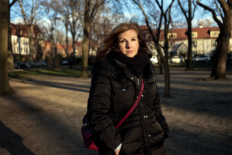Sasha Krasny near her home in Queens on March 28, 2022. She has been keeping in touch with her 83-year-old aunt, who is living in an apartment in Kharkiv, Ukraine, with blown-out windows. (Misha Friedman/The New York Times)