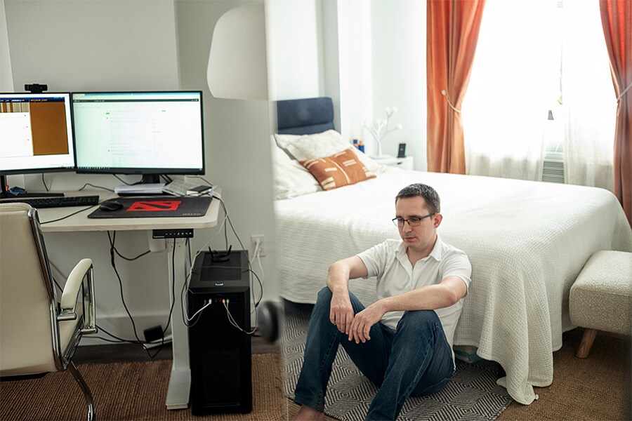 Nazar Lubchenko at his home in Hoboken, N.J., on March 25, 2022. He has the resources to help his parents flee Ukraine, but they prefer to stay put, he says. (Misha Friedman/The New York Times)