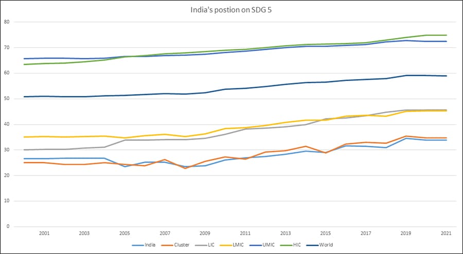 The findings of the study on SDG 5 are alarming for India, to say the least. Over the years, while the share of women in lower and single houses of national parliaments, as well as that of women in managerial positions, has been going up slowly but steadily in India, global improvement in these two aspects is far higher and faster. India has a long way to go before it reaches global standards in gender equality and empowerment. But, as the Figure below shows, the picture for India is even more shocking. For all the 22 years, the countries that have always appeared in the India cluster for SDG 5 are Afghanistan, Benin, Central African Republic, Cote d"Ivoire, Djibouti, Mali, Mauritania, Oman, Pakistan, Chad, Somalia and Yemen Republic, all of whom are among the bottom performers of Low-Income Countries, and also characterised by very high gender differentiation and discrimination against women. The two high-income countries that appear in the same cluster as India are Oman and Saudi Arabia, which have questionable gender equality records.