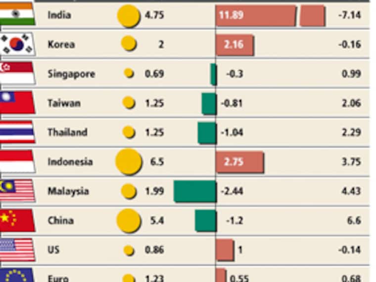 If inflation policy is a guide to interest rate policy, India and Korea are likely to be the first nations to raise interest rates in Asia. Inflation levels are higher than interest rates in both countries. According to Macquarie Research, real interest rate is minus 7.14 percent in India and for Korea it is 0.16 percent. Kaushal Sampat, COO, Dun & Bradstreet says, “D&B expects that RBI may increase the CRR [cash reserve ratio] by 50 basis points by the end of the current fiscal. This may happen in two phases — a 25 basis points hike by the end of December 2009 and another 25 basis points by end of March 2010.”
