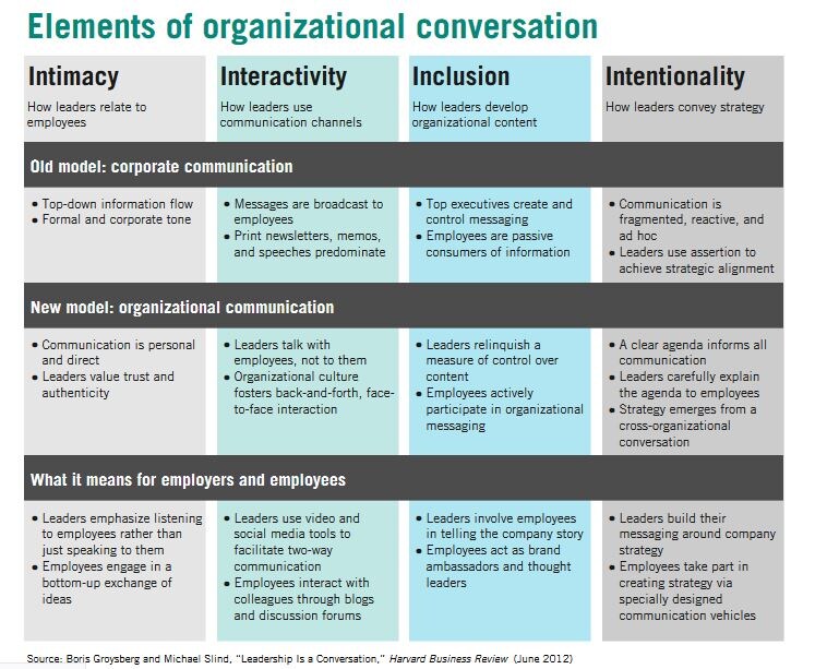 The book Talk, Inc.: How Trusted Leaders Use Conversation to Power Their Organizations, by Boris Groysberg and Michael Slind, explores how companies’ outreach strategies evolved from top-down, command-centric communiques to something more informal, immediate, and personal—from a C-suite monologue to a genuine back-and-forth between leaders and employees. This change has driven: