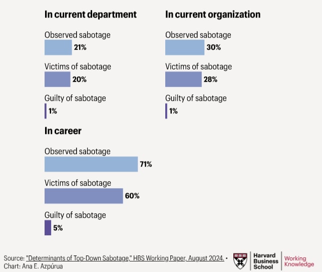 About 30 percent observed sabotage in their organizations, and 71 percent witnessed top-down sabotage at some point during their careers. In fact, 5 percent even admitted to sabotaging their direct reports over the course of their careers.