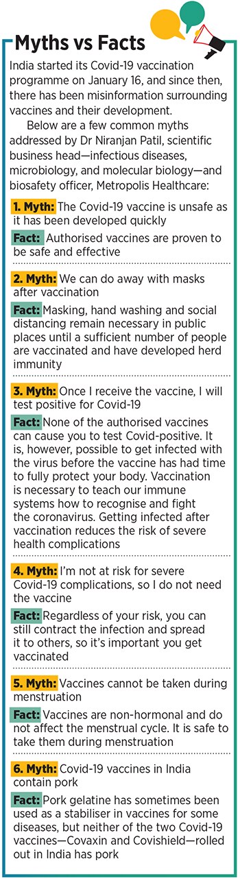 Doctors and scientists, however, say Covid-19 vaccines currently administered are safe and efficacious (see Myths vs Facts). “Vaccine development has gone through rigorous safety and testing. The process has been expedited at various steps, but the steps have not been ignored," says Dr Akhil Singh, assistant professor, anaesthesiology, pain medicine and critical care, All India Institute of Medical Sciences.