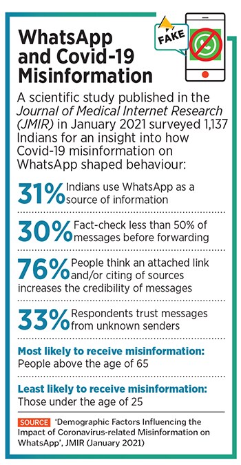 A January 2021 study by doctors from Rochester, US, and Pune, published in the Journal of Medical Internet Research, points out that 30 percent Indians use WhatsApp for Covid-19 information, and just about as many fact-check less than 50 percent of messages before forwarding them. About 13 percent of respondents say they never fact-check messages before forwarding. “Rumours on WhatsApp have resulted in chaos, panic, and mob lynching in many parts of the country. People are led to believe anything," says Nazakat, adding there have also been cases of doctors and health care workers falling for misinformation.