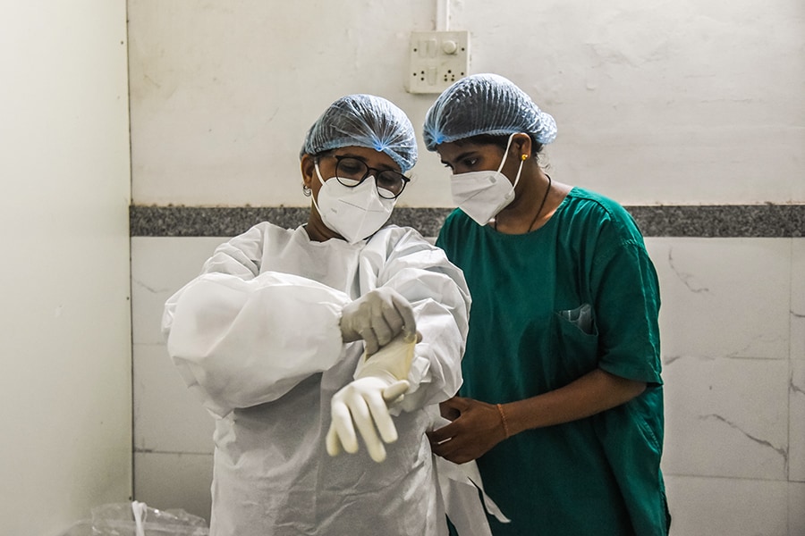 A colleague helps healthcare worker Shama Shaikh, 53, put on her PPE equipment before working with patients who have Covid-19 in an ICU ward at the government-run St. George hospital on May 27, 2021 in Mumbai, India. India"s prolonged and devastating wave of Covid-19 infections has gripped cities and overwhelmed health resources Image: Fariha Farooqui/Getty Images