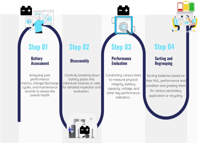 4. Sorting and Regrouping: In this final stage, batteries are sorted based on their performance and condition, categorizing them for reuse, repurposing, or recycling.