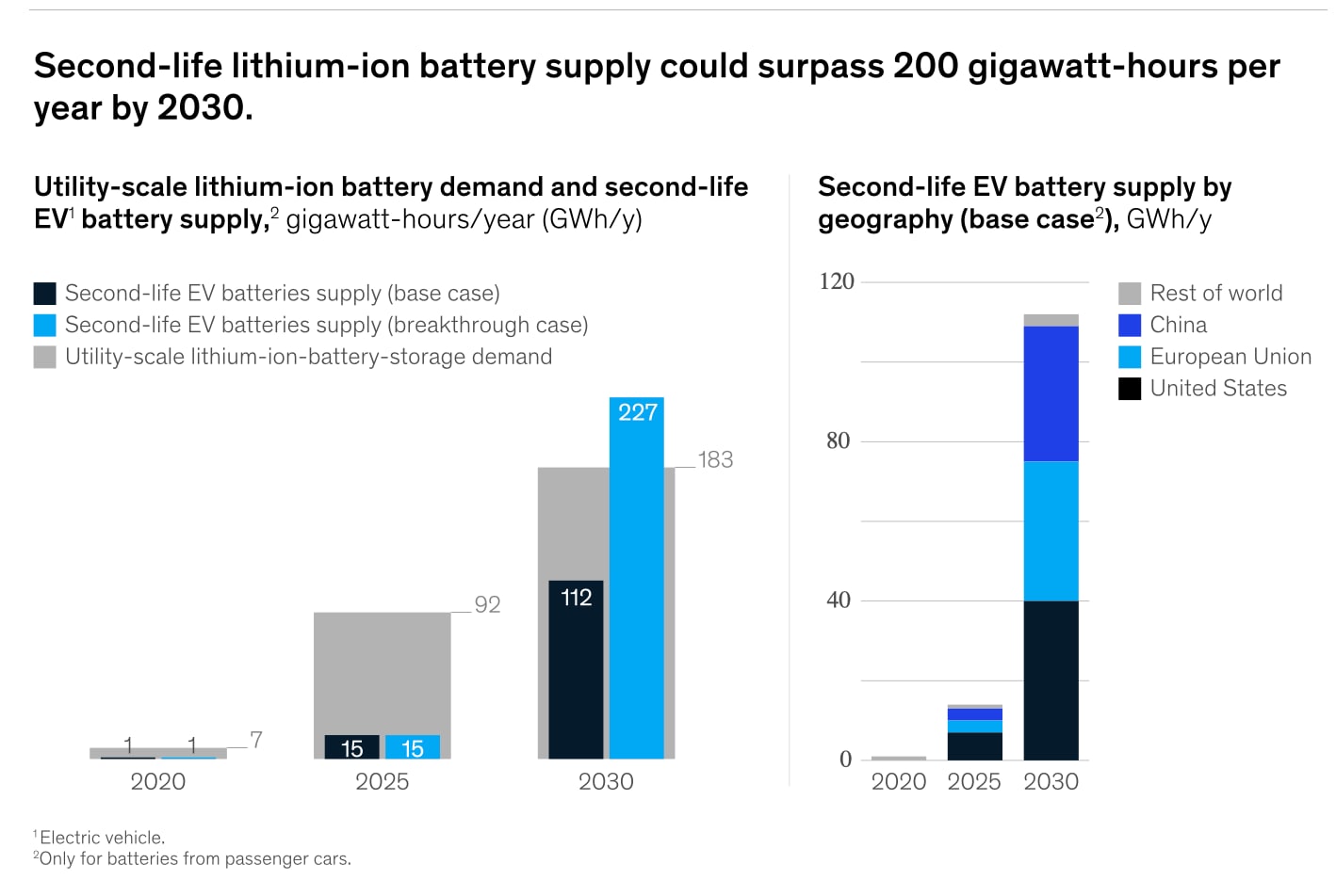 Mckinsey estimates that the supply of the second-life lithium-ion battery could surpass 200 GWh per year by 2030 (refer to Figure 1). Experts estimate that the raw materials contained within batteries produced in the last five years alone are valued at €20 billion, a figure projected to skyrocket to €600 billion by 2030 (Lopez, J., 2024). These figures underscore the immense economic potential that can be unlocked by the repurposing and recycling industry.