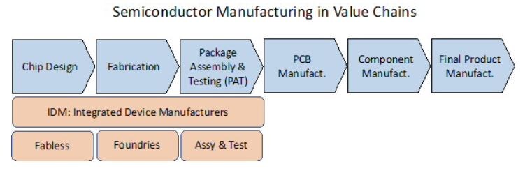 Semiconductor manufacturing consists of chip design, fabrication, and assembly and testing. Integrated device manufacturers (IDM) like Intel do all three. A modularized value chain also exists with specialists such as ARM, Nvidia, Qualcomm, Apple involved in chip design only and foundries such as Taiwan Semiconductor Manufacturing Company Ltd (TSMC) doing the chip fabrication (wafer processing). Package, assembly and testing is a labour-intensive process that is outsourced to low-cost manufacturing locations.