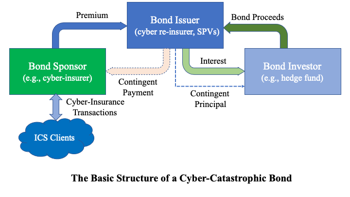 In the context of cyber-space, when a ‘rare’ catastrophe occurs (e.g., a critical ICS plant like a power plant shuts down for days at a stretch due to a cyber-attack) within a bond term (e.g., two years), the bond sponsor (the cyber-insurer paying premiums to a bond issuer) keeps a portion of the bond value to pay off aggregate first and third-party cyber-losses. The investors (e.g., hedge funds), on the other hand, lose some or all their principal (capital) invested. The bond issuer (e.g., cyber re-insurance firm along with special purpose vehicles and/or investment banks) creates the bond and pays interest to the investors after collecting premiums from the bond sponsor. If the catastrophic cyber event does not occur during the bond term, the investors get their invested capital back at a maturity date. In addition, the return on principal combined with coupon payments acts as the return on investment (ROI) for the investors. Since only catastrophic events trigger cat bonds, the portfolio-diversifying investors are happy to invest significant capital into cyber re-insurance markets (for higher returns) that, in turn, seep through to cyber-insurance markets.
