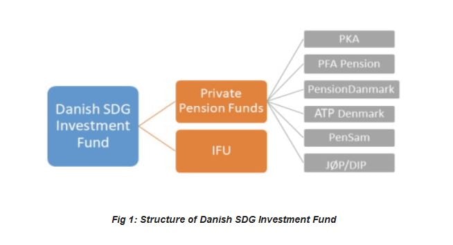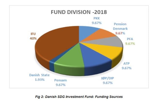 Danish SDG Investment Fund The Danish SDG Investment Fund is a newly formed fund under the PPP model, which includes the IFU and six other private pension funds, as shown in Figure 1. They mainly invest and advise businesses in the domain of renewable energy, infrastructure, agribusiness, etc. Investment is made either by acquiring equity or providing long-term and short-term loans to such companies. Various Danish companies also assist and mentor these firms through their expertise and knowledge in such domains. The fund is managed by IFU itself, which is highly experienced in such markets for about 40 years. All the pension funds and the IFU along with the Danish State, contributed a total of DKK4.1 Billion to the Danish SDG Investment Fund, as shown in Figure 2.