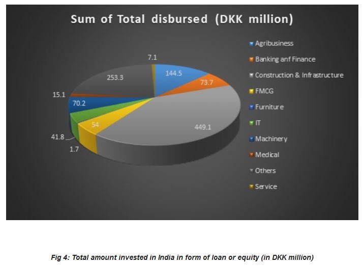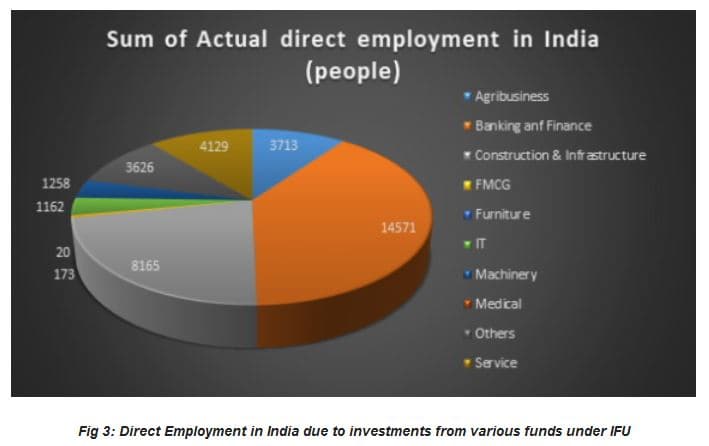 Denmark’s investments in India (under IFU) Many investment funds under the IFU umbrella have invested in India in the previous two decades to aid businesses in creating social and economic impact in line with UNSDGs. These investments are estimated to have created 36817 jobswith a total foreign investment of DDK 1110.5 million. Such significant investment in businesses creating a social impact in India has led to a widespread increase in various other factors like total employment, living standards, and technology-enabled infrastructure with good returns on capital. The sector-wise distribution is seen in Figures 3 and 4.