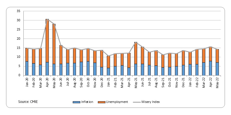 The Indian economy was all set to turn the corner at the beginning of 2022. Despite the Omicron wave, unemployment at 6.6 percent in January was the lowest in 10 months. Inflation at 6 percent was just at the upper end of the RBI’s target band. But the global economy received an unexpected jolt with Russia invading Ukraine in February. As global oil prices surged, inflation in India shot up to an 8-year high of 7.8 percent in April. With the unemployment rate also clocking 7.8 percent in April, stagflation whispers grew louder. How serious is the risk of stagflation? What are the prospects for the Indian economy in the short and long-run? Let us start with the ‘misery index’.