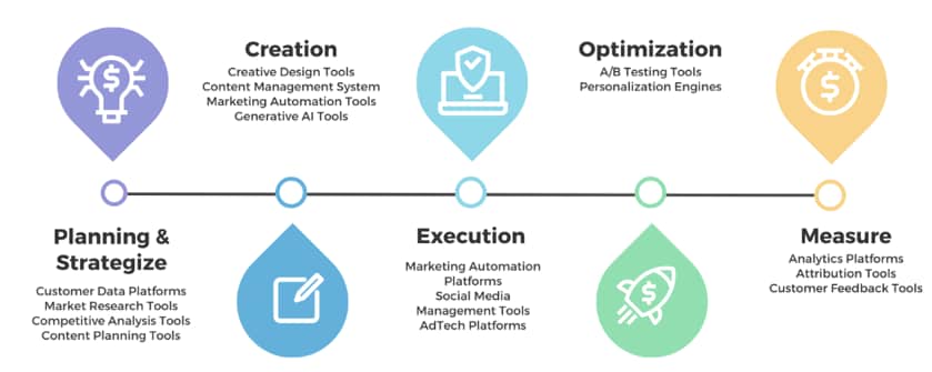 While these thousands of technologies may seem overwhelming at first glance, marketers can navigate the MarTech adoption journey smoothly by following a simple framework. This involves choosing technologies based on the Marketing Activity Stages outlined below.